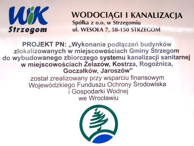 Zadanie pn. "Wykonanie podłączeń budynków zlokalizowanych w miejscowościach Gminy Strzegom do wybudowanego zbiorczego systemu kanalizacji sanitarnej w miejscowościach Żelazów, Kostrza, Rogoźnica, Goczałków, Jaroszów" zrealizowano przy wsparciu finansowym Narodowego Funduszu Ochrony Środowiska i Gospodarki Wodnej w Warszawie oraz Wojewódzkiego Funduszu Ochrony Środowiska i Gospodarki Wodnej we Wrocławiu.