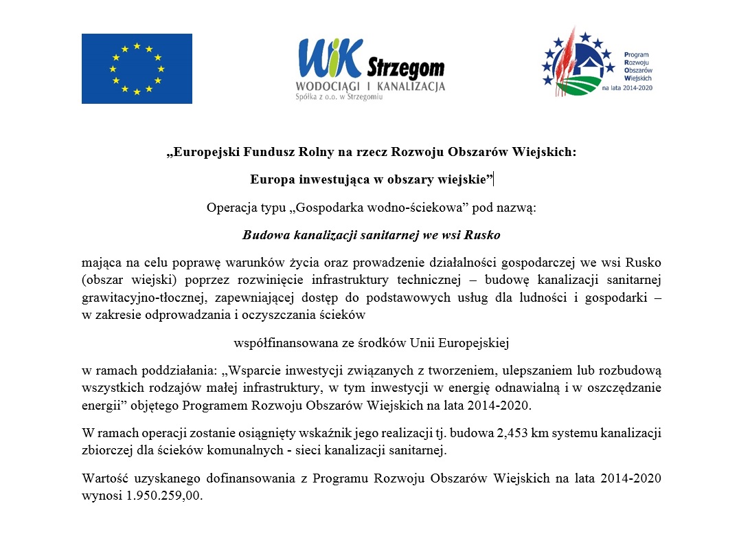 Zadanie pn. „Budowa kanalizacji sanitarnej we wsi Rusko” zrealizowano w ramach poddziałania „Wsparcie inwestycji związanych z tworzeniem, ulepszaniem lub rozbudową wszystkich rodzajów małej infrastruktury, w tym inwestycji w energię odnawialną i w oszczędzanie energii” objętego PROW na lata 2014-2020: