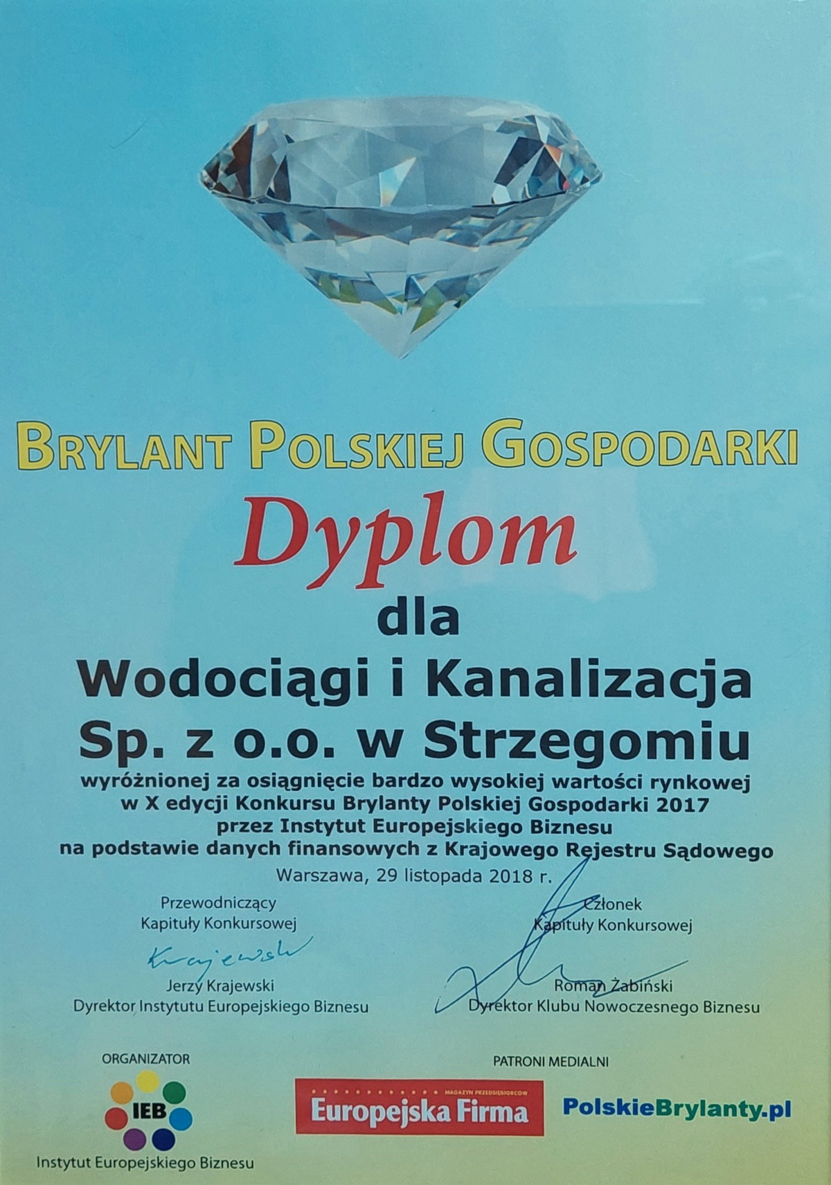 Wodociągi i Kanalizacja Sp. z o.o. w Strzegomiu to Brylant Polskiej Gospodarki, Gepard Biznesu i Wielki Modernizator 2021.